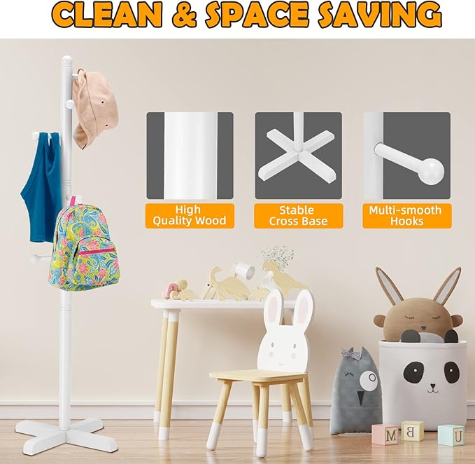 Kids Coat Rack, Freestanding Coat Racks with 8 Hooks 2 Adjustable Height, Tree Coat Rack for Bedroom, Hallway, Entrance, Office, Hats, Handbags,Purse (White)