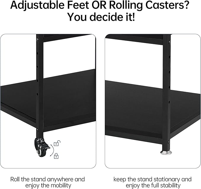 - 【Industrial Grade Casters】Featuring upgraded industrial-grade wheels, this printer cart glides effortlessly even when fully loaded. With all four wheels lockable, the cart can be secured in place firmly. Alternatively, just opt for the included foot pads to keep the stand stationary for complete steadiness. These foot pads can be fine-tuned to prevent wobbling on uneven surfaces, guaranteeing a stable and secure stand.