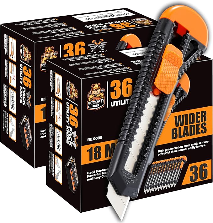 REXBETI Utility Knife, Retractable Box Cutter for Cartons, Cardboard and Boxes, 18mm Wider Razor Sharp Blade, Smooth Mechanism, Perfect for Office and Home use (72 Pack)
