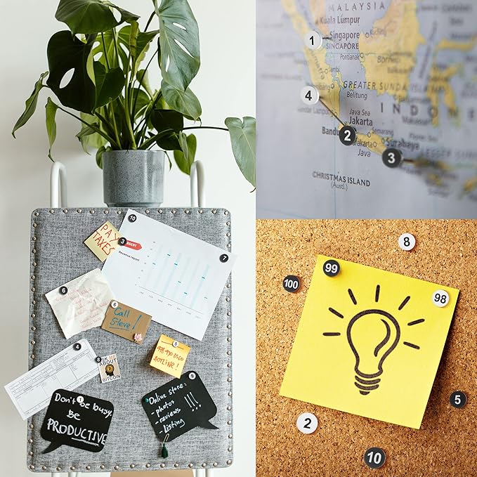 - 【Features】Our thumb tacks are uniquely numbered from 1 to 100, making it convenient for counting or organizing. Available in both black and white, they cater to different needs. Furthermore, the numbered push pins are neatly stored in a reusable clear container case. This not only keeps your desktop or desk drawer organized but also ensures the safety of young children by preventing their access to the thumb tacks.