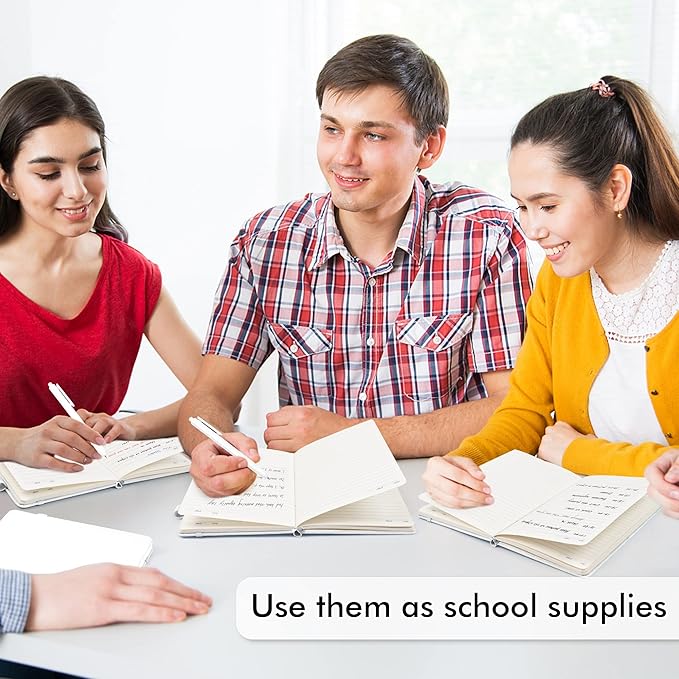 - Feela 5 Pack Classic Ruled Notebooks contains 5 white ruled sturdy cover notebooks and 5 Black Retractable Pens. Each of the notebooks measures 8.3” x 5.1”, which is perfect to carry and easily held by young girls and boys. These black cute pens are customized to be placed in the pen holder, which is pretty convenient.
