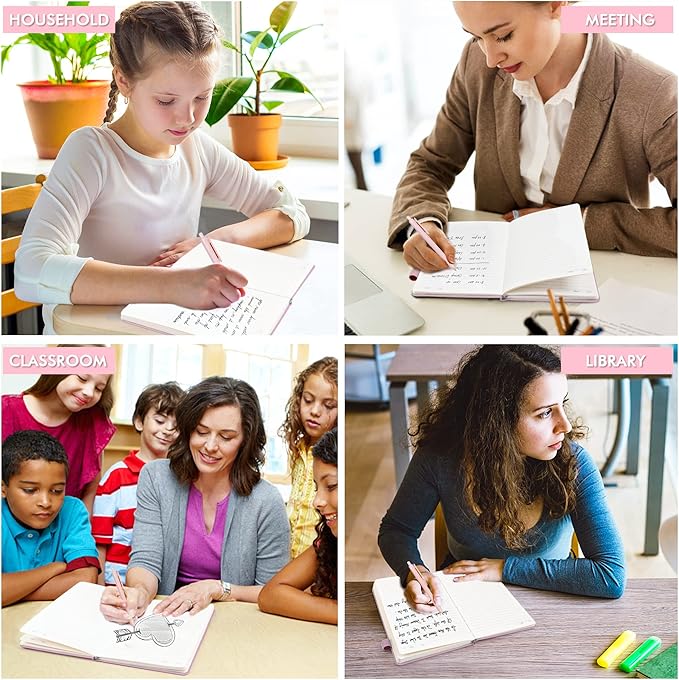 - Feela 5 Pack Classic Ruled Notebooks contains 5 rose pink ruled sturdy cover notebooks and 5 Black Retractable Pens. Each of the notebooks measures 8.3” x 5.1”, which is perfect to carry and easily held by young girls and boys. These black cute pens are customized to be placed in the pen holder, which is pretty convenient.