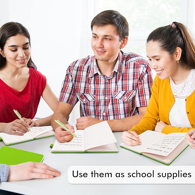 - Feela 5 Pack Classic Ruled Notebooks contains 5 green ruled sturdy cover notebooks and 5 Black Retractable Pens. Each of the notebooks measures 8.3” x 5.1”, which is perfect to carry and easily held by young girls and boys. These black cute pens are customized to be placed in the pen holder, which is pretty convenient.