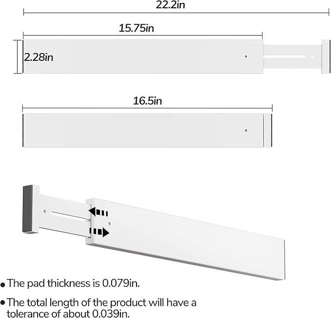 - EXPANDABLE: The size is 16.77 inch (un-expanded) to 22.05 inch (expanded); The pad thickness is 0.079 in, and the total length of the product will have a tolerance of about 0.039 in; Compressed packaging in transit may prevent the spring from being fully stretched to a sufficient length; At this time, please manually pull out the dividers to the top to ensure sufficient length