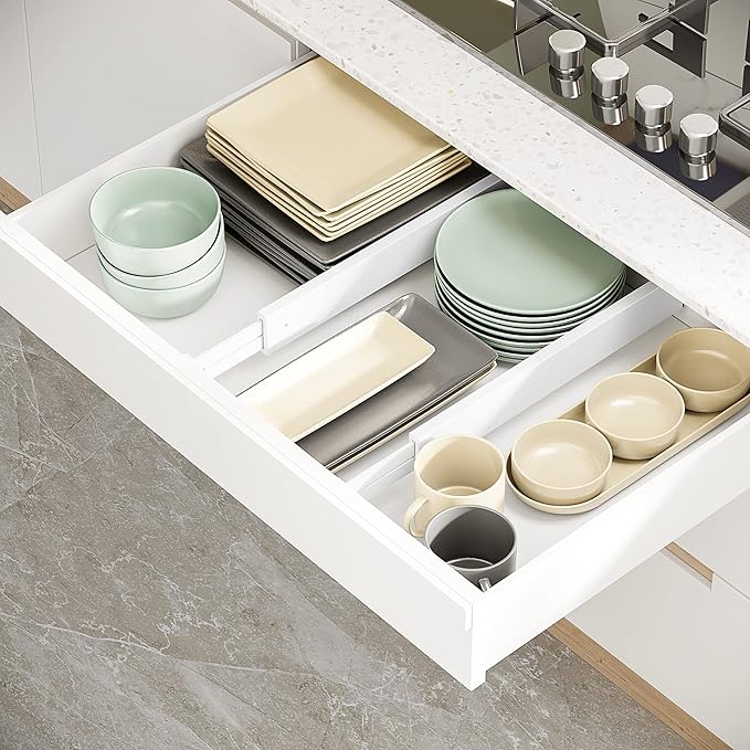 - MULTIPUL USED FOR ORGANIZATION: You can use BAMEOS drawer dividers in any drawers of your bedroom, office, kitchen, living room and garage; It can keep your drawer neat and organized all the time