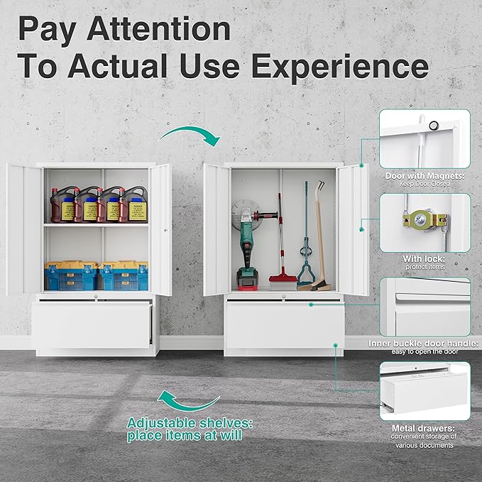 - 【Large Capacity】 : Storage cabinet with doors and shelves, 1 adjustable shelf to meet your different needs for placing items, shelf & door lock can highly protect items from temperature, dirt & dust, & equipped with a drawer , for letter/legal/A4 size documents
