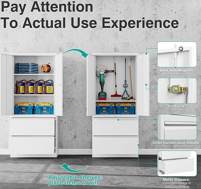 - 【Multiple Uses】: 2 door storage cabinet design with high-grade lock picking to secure valuables, and also it is enable to be mounted to the wall,thus you can place it in office, home, basements, shop, warehouse, school etc