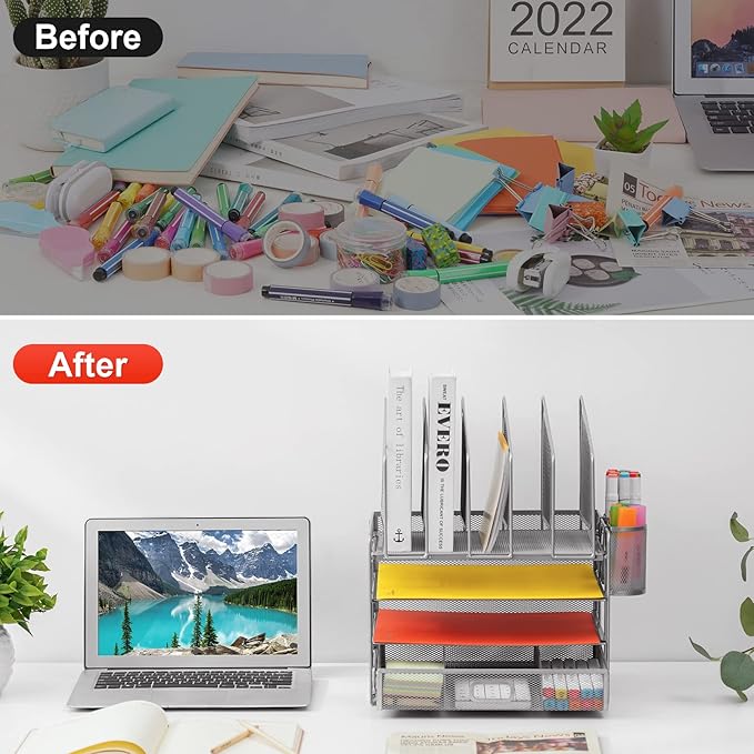 - 【Multifunctional Desk organizer】Marbrasse upgrade desktop file organizer has vertical and horizontal storage space – 4 sliding trays +5 vertical sorters +3 compartments drawer+ additional 2 pen holders . Upright section has five 3" Compartments for magazines, bill, file, book. Three types of use to meet your various office needs!!