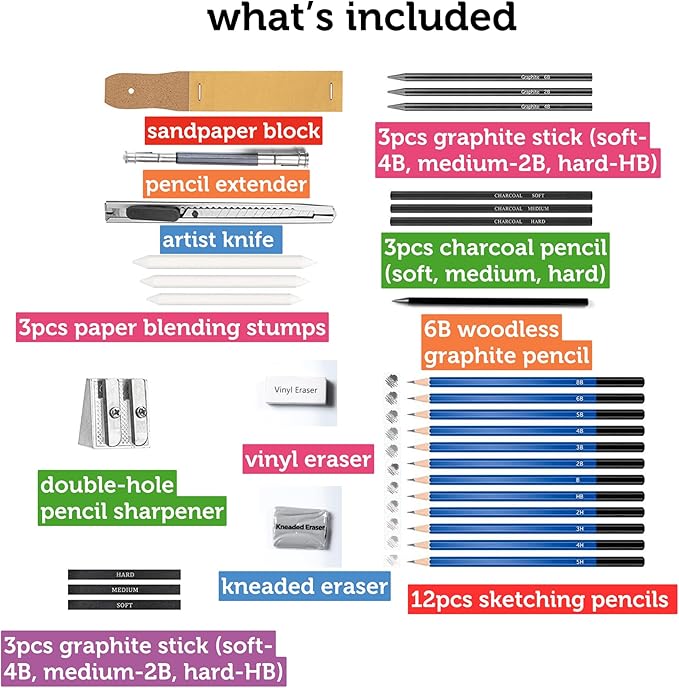 - VALUE PACK: Each sketching pencil set includes assorted 12 Sketching Pencils (5H, 4H, 3H, 2H, HB, B, 2B, 3B, 4B, 5B, 6B, 8B), 6B Woodless Graphite Pencil, 3 Charcoal Pencil (Soft, Medium, Hard), Kneaded Eraser, Sandpaper Block, Pencil Extender, Paper Blending Stumps, Artist Knife, 3 Charcoal Stick (Soft, Medium, Hard), 3 Graphite tick (Soft-4B, medium-2B, Hard-HB), Vinyl Eraser & Double-hole Pencil Sharpener.