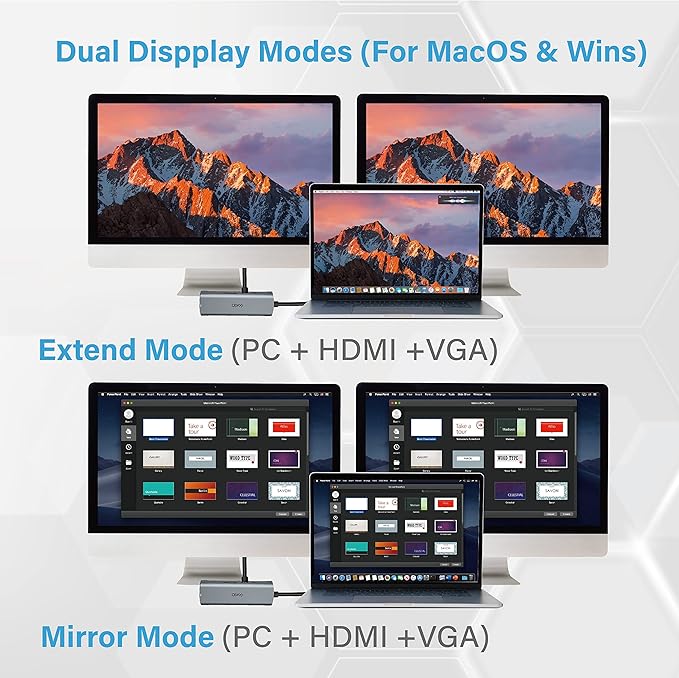 - ✔️4K Crystal-clear Dual Display: Mirror or extend your screen to two displays in 4K@ 30Hz or 1080P@60Hz by using HDMI or VGA port, or directly stream video to an HDTV, monitors, or projectors for a cinema-like visual feast. Unlimited to meet signal stability requirements and to avoid the embarrassing situation of working in different locations with incompatible signal connectors.