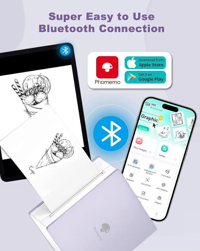 - Bluetooth Mini Thermal Printer- for cell phones and tablets with Bluetooth connectivity, compatible with Android 7.0 and iOS 13.0 or above.The Phomemo M02 sticker printer machine is an inkless wireless printer, you don't need any ink or toner. Not only is it suitable for white self-adhesive and thermal paper (only black and white colors can be printed), but it can also print patterns and text on colored and transparent paper rolls (special paper rolls can be printed in a single color)