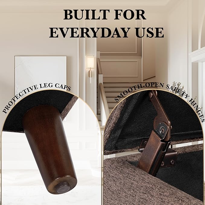 - STORAGE OTTOMAN: Our Accent Piece Fabric Ottoman features a hinged lid and with its versatility can be used as a Foot Stool Ottoman or Vanity Seat | Perfectly completed with tapered wood legs in a striking dark walnut finish along with stitching details for added interest