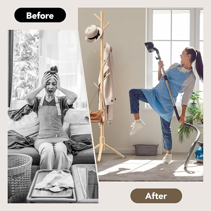 - Unique Craftsmanship: Hupmad freestanding coat rack is made of New Zealand pine wood, which is strong. The columns and hooks have a fine polished surface with a smooth and rounded feel. Protect your clothes from being scratched. The solid wood coat rack retains the natural wood grain and provides a simple and elegant versatile style