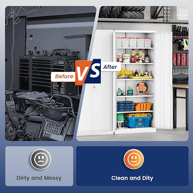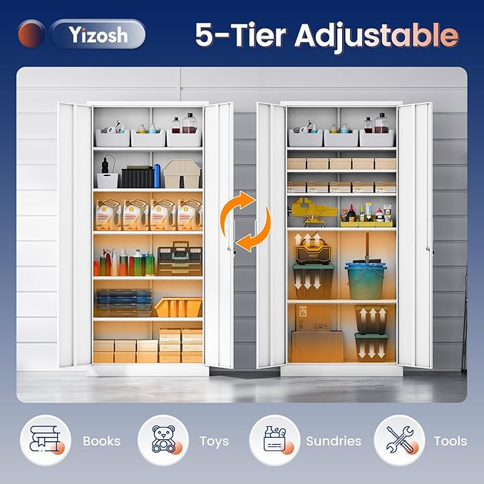 - 『PRACTICAL DESIGN』:Our tall metal cabinet equipped with lock and 5 adjustable shelves to provide adaptability and convenience. High-grade lock picking to secure valuables, two keys are included. Regardless of what your storage needs are, you have the ability to create a unique storage space to suit them.