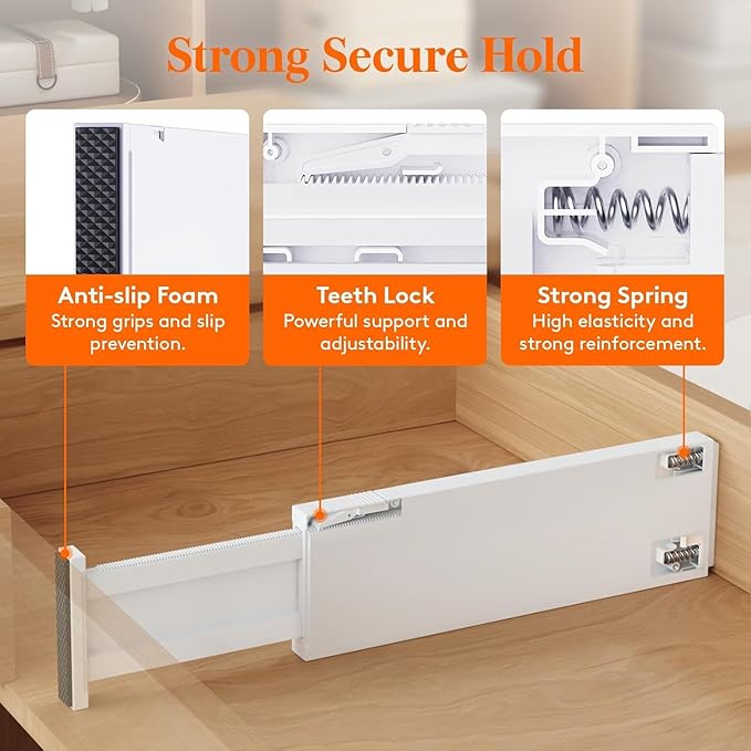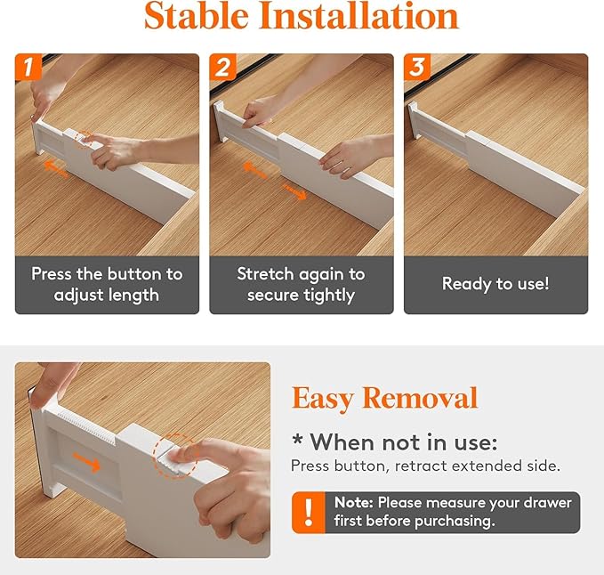 - Easy Installation & Removal: Press the top button to adjust the length before placing, and stretch it out again to secure it tightly before locking it. The strong spring tension keeps each drawer organizer securely upright. To retract, press the top button and push the stretched side.