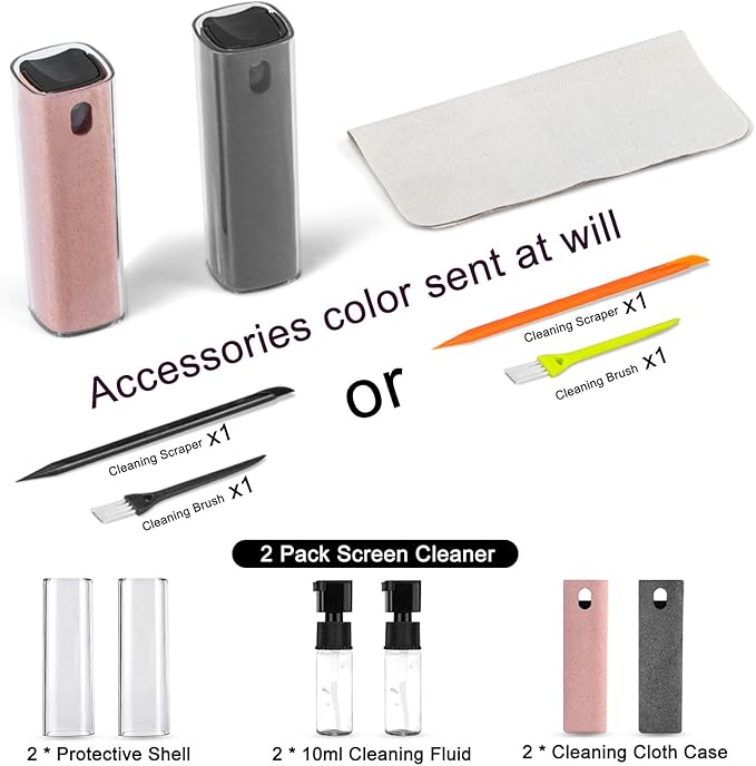 - 2-in-1 Screen Cleaner Kit (Set of 2): All-in-1 cleaning tool that includes 2 Pieces Cleaner sprays with 10ml solution in them and covering microfiber cloth on its face layer; A cleaning pen for Airpods and IOS/ Android Charging Port; Small keyboard brush, and soft plush glasses clean cloth. 2 Pack item offers you the change to share with friends.
