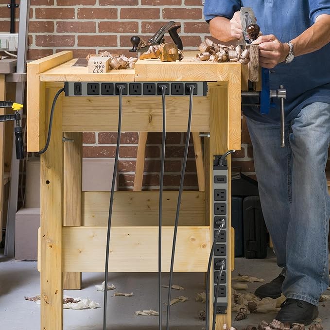 - 1200J Surge Protector: Sturdy power strip garage with overload protection, the reliable overload switch will trip off automatically to protect your devices when over-voltage, over-current, overload, high-temperature, short-circuiting.