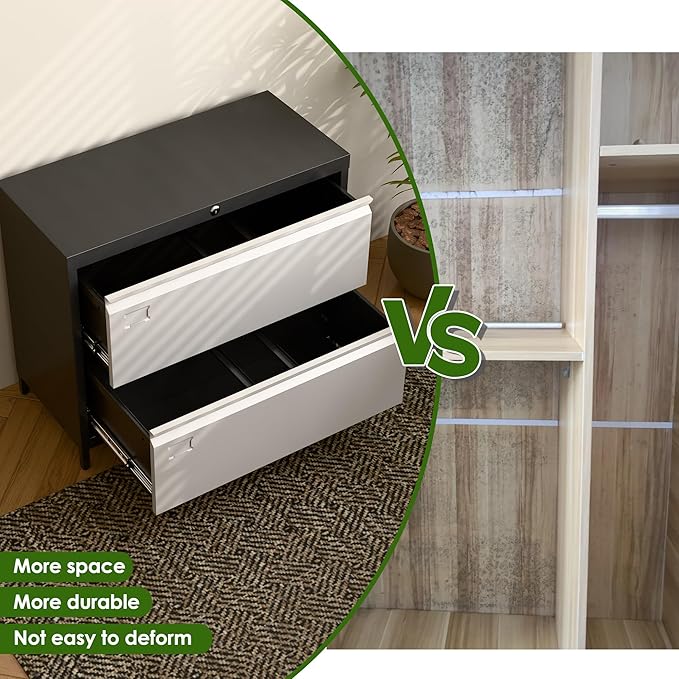 - Durable Steel Construction & Scratch-Resistant Finish:Built with heavy-duty solid steel, this lateral file cabinet delivers reliable stability for home offices or professional workspaces. The smooth powder-coated surface resists scratches and fingerprints while allowing effortless cleaning—maintaining a sleek, modern look for years.