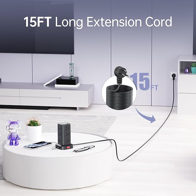 - 【15FT Long Extension Cord】The 15FT upgraded extension cord with multiple outlets is made of pure copper. Reinforced design at the junction of the stand of power strip tower and the wire head. To protect the terminal from wear and tear. Environmental protection and fire-resistance PC shell with flame retardant at 1382℉ makes it more safe and longer lifetime.