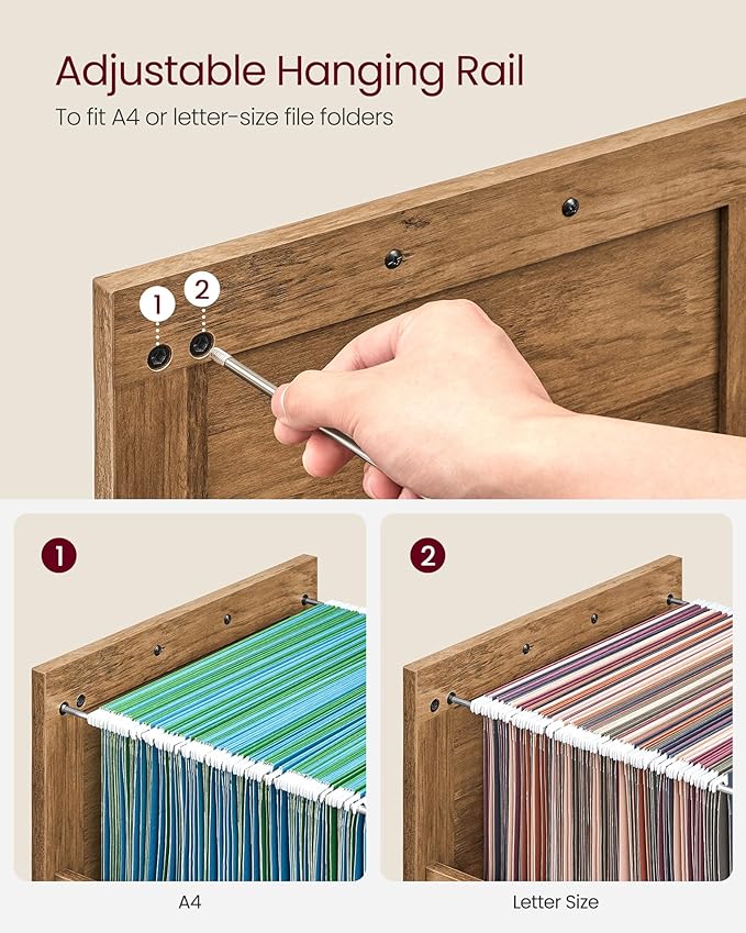 - [Storage Aplenty] Keep your workspace organized with this roomy filing cabinet. The top 2 drawers are perfect for stowing away office supplies, while the bottom file drawer with an adjustable hanging rail gives your A4 or letter-size file folders a home