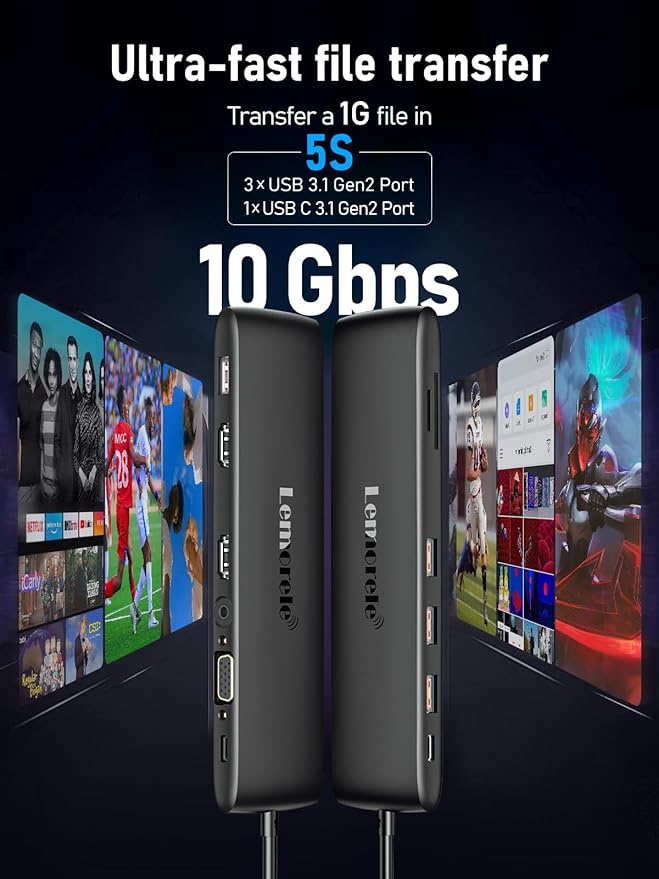 Lemorele USB C Dual Monitor Docking Station for Dell/HP/Lenovo/Surface Laptop, 12 in 1 Triple Display Multiport Hub Adapter w/2 HDMI 4K+VGA+10Gbps 2 USB3.2+2 USB2.0+100W PD+USB C Data+SD/TF+Audio