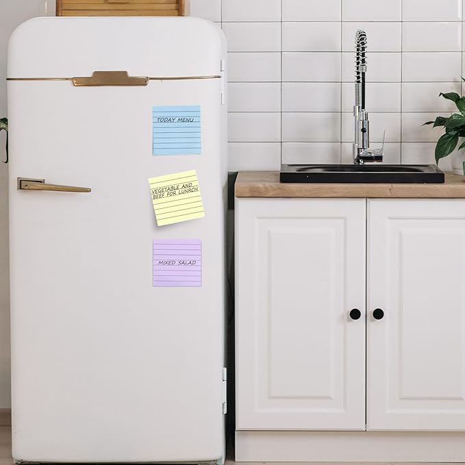 - MATERIAL: lined sticky notes are made of thick paper, which will not easily break, quality adhesive and quality paper ensure sheets stay on any surface without curling, not easily to fall off, and removes cleanly as well.