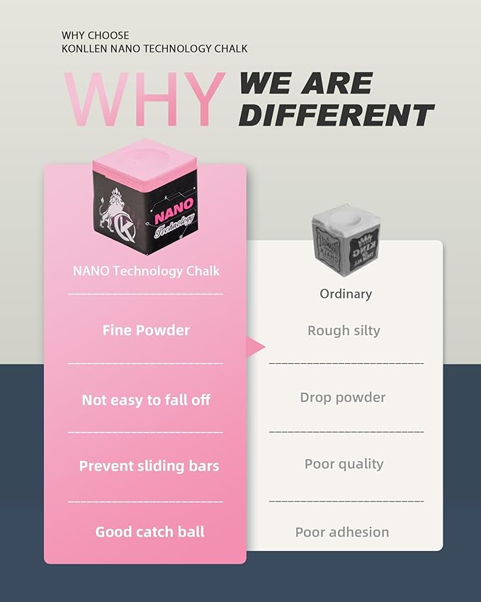 • The Right Choice: Unlock your true potential on the billiards table with KONLLEN Chalk, the ultimate choice for players who demand professional-grade performance. KONLLEN Chalk delivers unmatched control, spin, and durability, ensuring every shot is executed with precision and confidence.