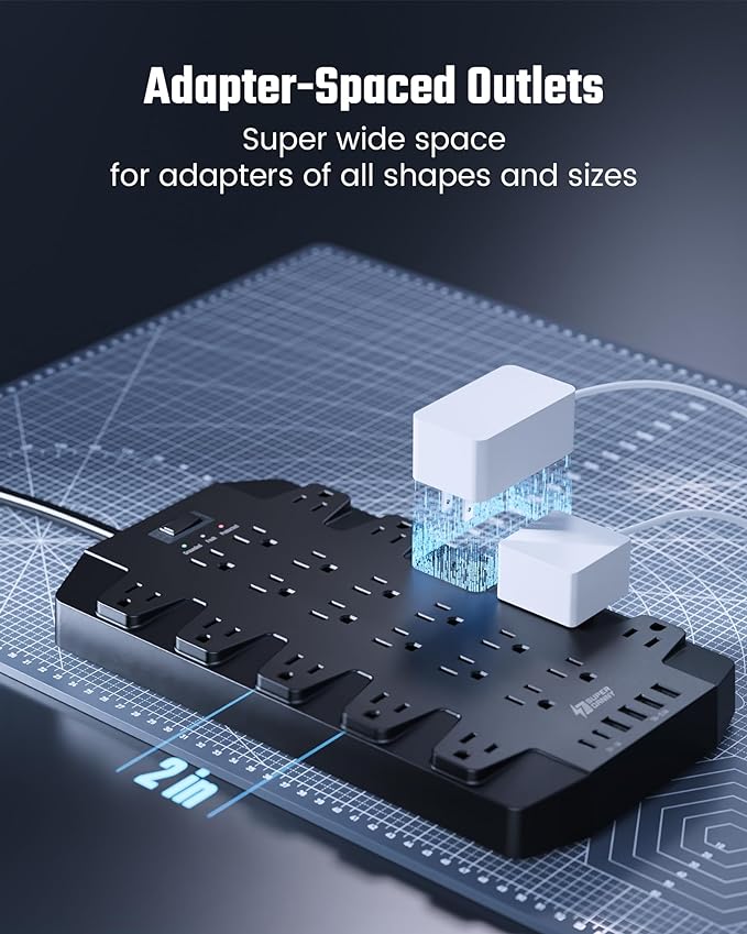 - 【2" Super Wide Layout】Check our game-changing surge protector power strip with an impressive 2" extra-wide AC outlet spacing! SUPERDANNY outlet extender stands out with its wider socket spacing, perfect for accommodating bulky plugs and power adapters side by side, with none of them getting blocked. The four rows of outlets give you numerous ways of plugging in a variety of cords. No need for multiple power strips