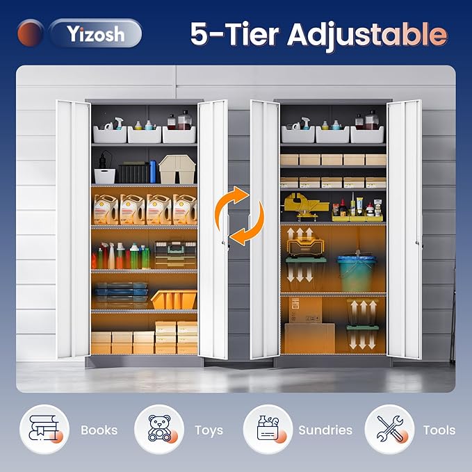 Yizosh Metal Storage Cabinet with 2 Locking Doors and 5 Adjustable Shelves, 72" Garage Storage Cabinet Steel Lockable for Office,Home,Garage