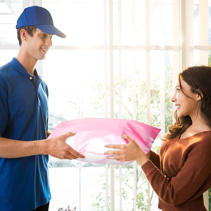 - Eye-Catch Poly Mailers Bags--- Usable size: 24x24 Inch, 50Pack. These large shipping bags have a pink outer surface, and gray inner lining, a highly attractive color that makes your products look better. Their smooth texture makes it easy to affix self-adhesive stamps and address labels, helping you customize your brand.