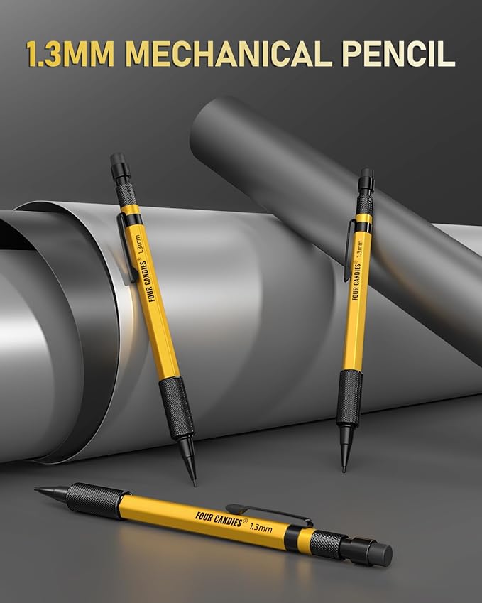 - Exquisite Carpenter Set: Includes 3pcs 1.3mm metal mechanical pencils, 4 tubes of 2B lead refills (12pcs/tube), 24pcs color lead refills (red yellow), The length of each lead is 120mm, 3pcs 4B soft erasers, 16pcs cap eraser refills, a plastic mechanical pencil case.