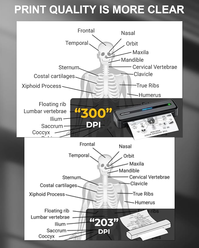 - CLEAR PRINT QUAILITY & EASY TO USE: Our wireless thermal printer is 300DPI, compared to most of the mini thermal printers on the market is 203DPI, the print quality is more clear. The mini portable printer is easy to install and use. The printer includes detailed videos on the official website to assist you in making printing easier and simpler.
