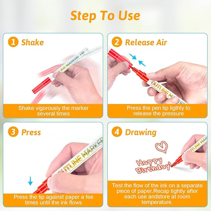 - Easy to Use: The outline markers self-outline metallic markers adopts a three-layer anti-slip design, which saves effort to open the cap, With the cap on, shake the marker several times well to mix the ink, and then press down the markers pen tip a few times to pump the ink until it starts to flow, Suggest re-cap the markers immediately after using and store horizontally.