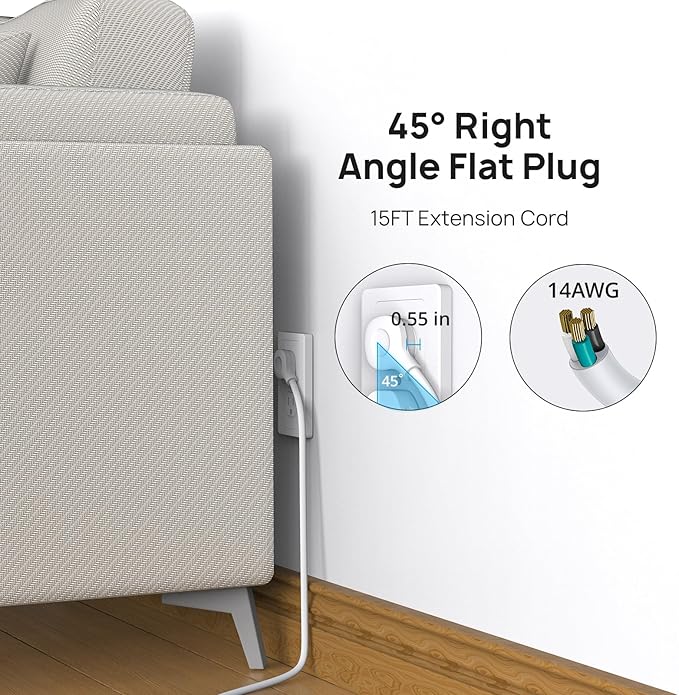 - 15ft Extension Cord Flat Plug: This surge protector is made of 14 AWG pure copper for extra durability, the 15ft extension cord is heavy duty and has better current carrying capacity (15a). The low profile right angle flat plug eliminates awkward cords from cluttering and doesn’t block the bottom receptacle