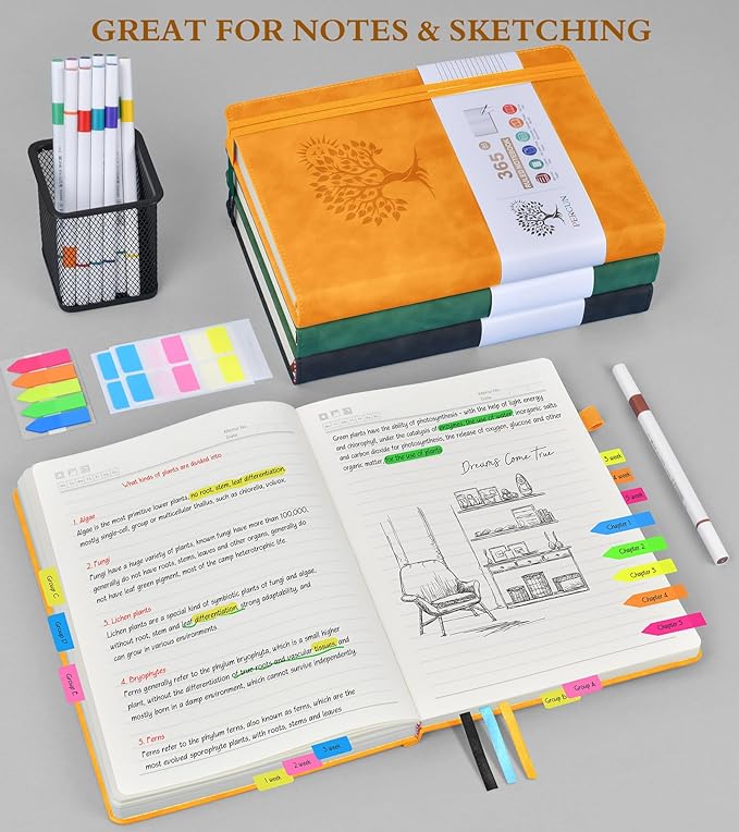 - 【180°Lay Flat for Writing】Our notebook also comes with 180°Lay Flat Journal Notebook, which makes writing a breeze. The elastic pen holder and bookmark ensure that you never lose track of your pen, and the 2 elastic closures ensure that your journal stays securely closed. The 3 colored ribbon bookmarks and 3 sticky labels provide even more ways to customize your journal to your liking.Built-in back pocket that is great for storing loose notes, cards, or other important items.