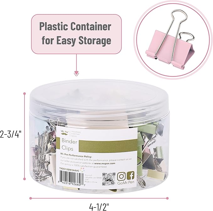 - Mr. Pen binder clips set is a colorful assortment of 120 clips, available in 6 sizes to suit a wide range of organizing needs, all neatly presented in a transparent, round container for easy selection.