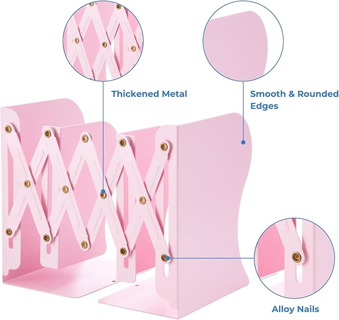 M&G Adjustable Bookends Book Ends for Shelves, Metal Bookend for Heavy Books, Desk Magazine File Organizer Holder Extends up to 20in, Book Stopper for Home, Office, Classroom (Pink)