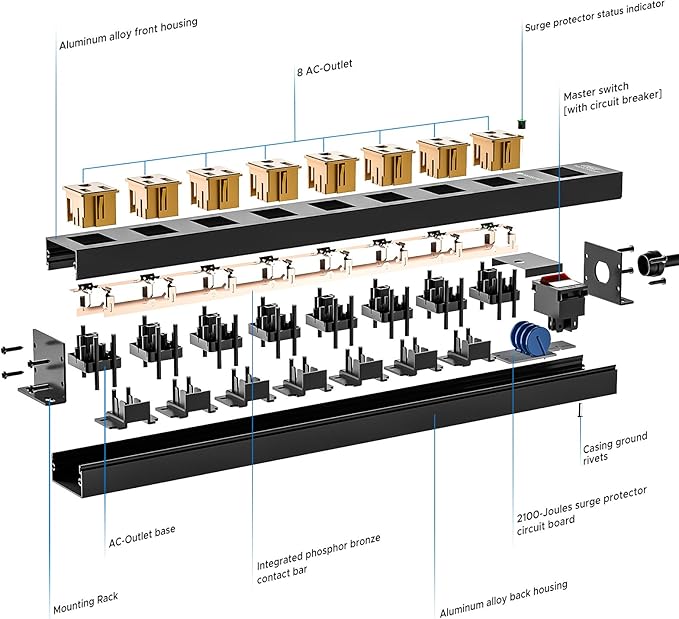 - [Metal Heavy Duty] Heavy duty power strip with 1.5mm extra-thick aluminum alloy housing and reinforced engineering plastic covers make it extremely strong and durable. The 8 outlet power strip is equipped with a sturdy 6ft cord, allowing convenient placement of the metal power strip in locations far from the power source without worrying about the cable being too short. And 15AMP/14AWG SJT grade wire supports up to 125V/1875W of power.