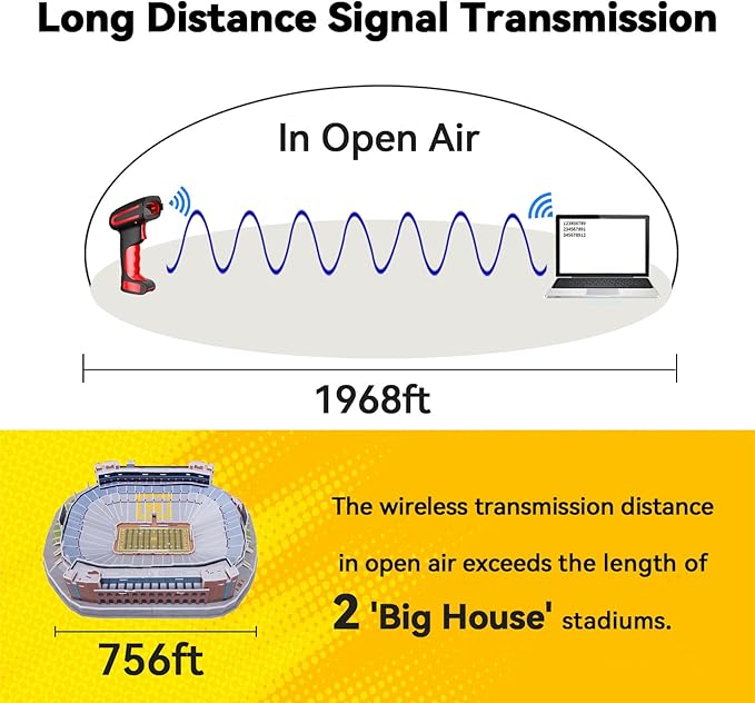 - 【Exceptional Signal Range】 The Alacrity 433MHz RF wireless barcode scanner stands out with its long-distance transmission capabilities. In an unobstructed environment, it can transmit signals up to an impressive 1968 feet (600 meters), and even in environments with obstacles, it reaches a substantial 656 feet (200 meters). This extended range makes it a perfect fit for large warehouses where signal coverage is crucial.