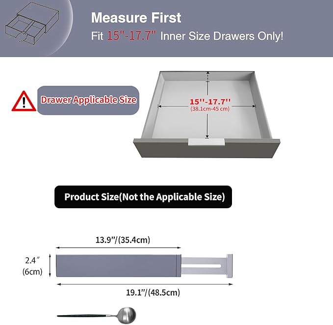 - Recommend Drawer Dimension: **Measure Your Drawers Before Buying!** This product is designed for drawers with an inner size of 15" to 17.7". If your drawer's inner size exceeds 17.7", please opt for our larger size