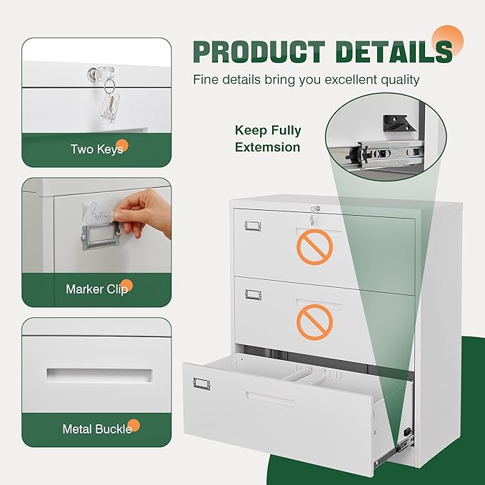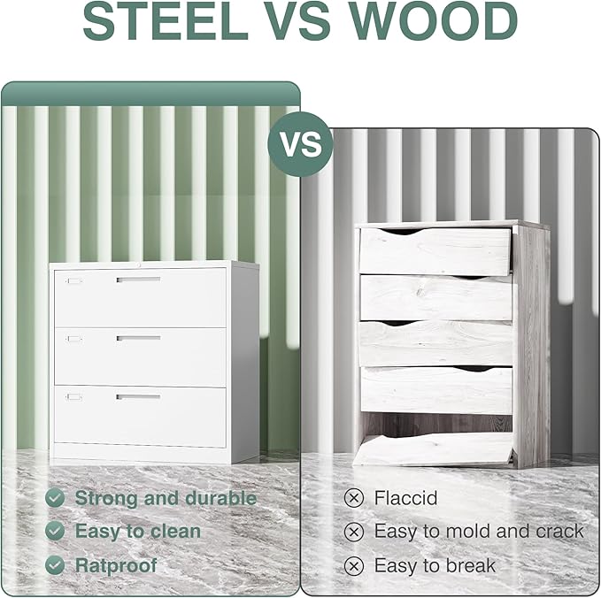 - All-Steel Rustproof:Lateral file cabinet is made of thick high-strength cold-rolled solid all-steel material.Rugged and not easily deformed, powder-coated construction making it immune to corrosion and rust.It is ideal for long-term use