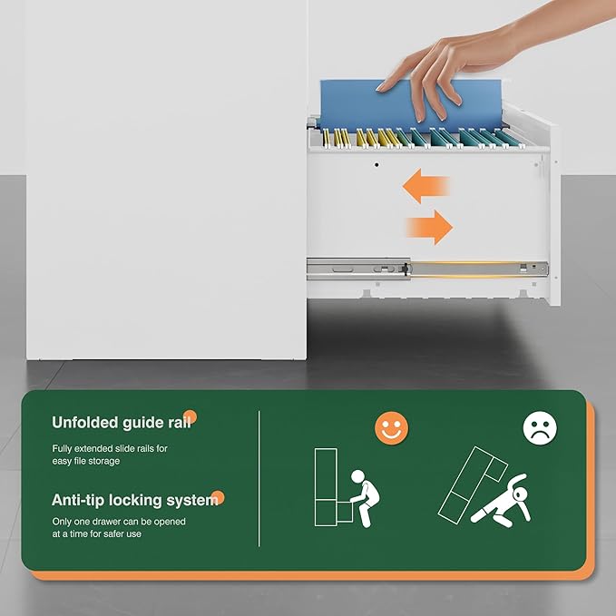 - Unique Design:Built-in interlock system secures all drawers to make sure safe file, with folding key lock convenient to carry. With all drawers interlocking mechanism design, it will prevent tipping.Ball bearing full suspension drawers that open and close easily and quietly