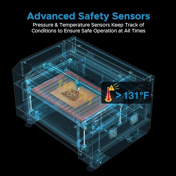 - Enhanced Safety: Our built-in sensors continuously monitor temperature and air pressure, stopping the machine when necessary, while the powerful air pump and 318 cfm turbo exhaust fan maintain a clean workspace by minimizing dust and debris