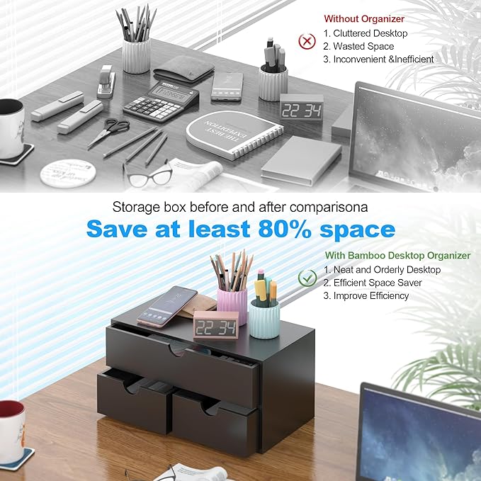 Bamboo Desk Organizer with Drawers Desktop Storage Drawers for Bills Office Supplies Kitchen Utensils Organizing Tool for Home Classroom Organization No Assembly (Black)