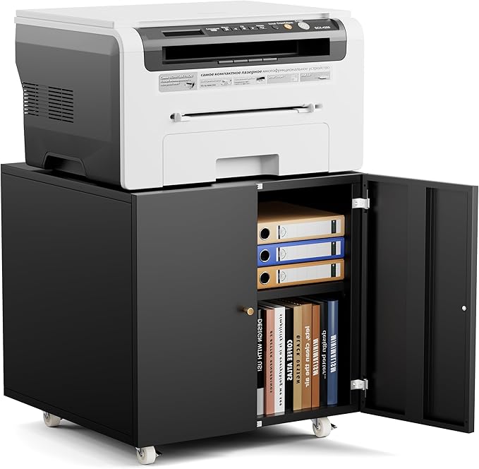 Warmiehomy Metal Printer Stand with Storage Mobile Printer Tables for Small Spaces with Door Adjustable Shelf File Cabinet on Wheels for Home Office (Black)