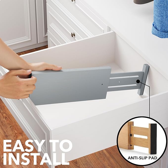 - Drawer Dividers That Stay in Place: Strong spring-loaded design makes them sturdy dividers, with non-slip rubber pads in the end, keeping it stay put all the time and protect your drawers from scratches