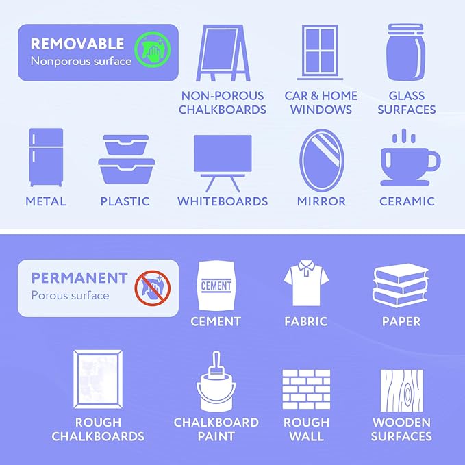 - Easy to Clean: When you’re ready to write & start fresh, a mere wipe of a wet paper towel will remove your erasable chalk markers completely and easily from almost any non-porous surface