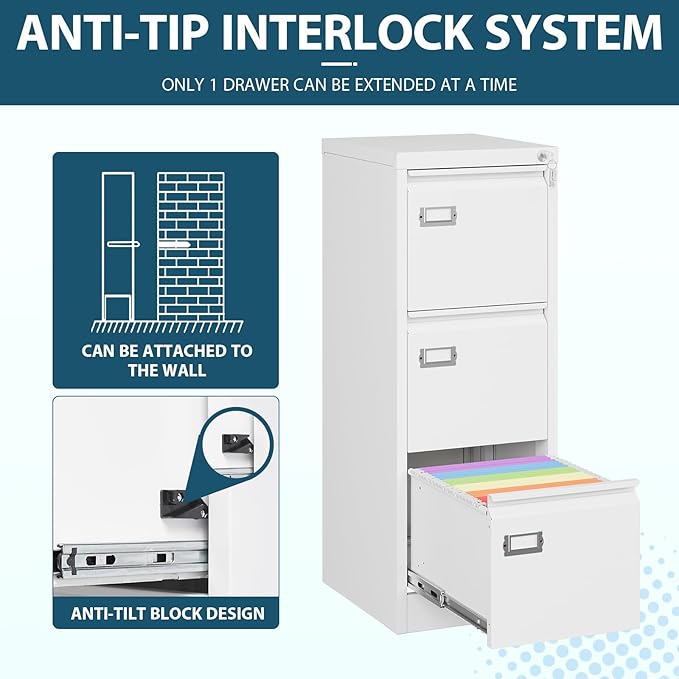 - 【Metal File Cabinet】This 3 drawer file cabinet is made of cold-rolling steel. A durable steel construction supports dependable lasting use. Each drawer is equipped with hith quality & full extention glide rails.