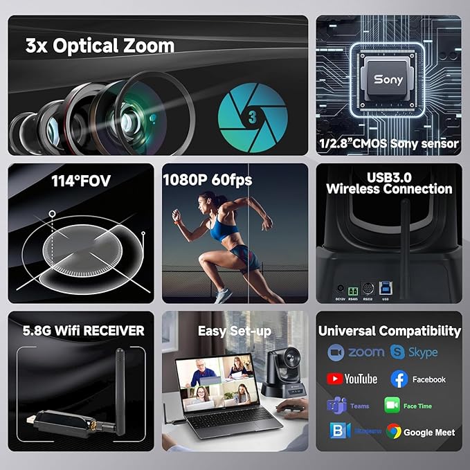 - 3X 1080P 60FPS USB3.0 5.8GHZ WIRELESS PTZ CAMERA OFFERS EASIER VIDEO CONFERENCE SOLUTIONS. With a 50ft transmission distance, the TONGVEO wireless live streaming camera comes with a 5.8GHz USB receiver, so you can expect clear, undistorted online working. The superior white balance and exposure mode make the video more vivid. The video compression format supports YUV, MJPG, and H.264, which makes motion video vivid under low bandwidth conditions.