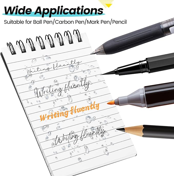 - Write in the Rain:You can write freely in the rain, as water will not seep into the pages and erase your handwriting. When the paper dries, ballpoint pens and permanent markers work perfectly. The small notebook is durable in all weather conditions, such as travel, camping, office, and outdoor settings, making it an ideal all-weather waterproof spiral notebook.